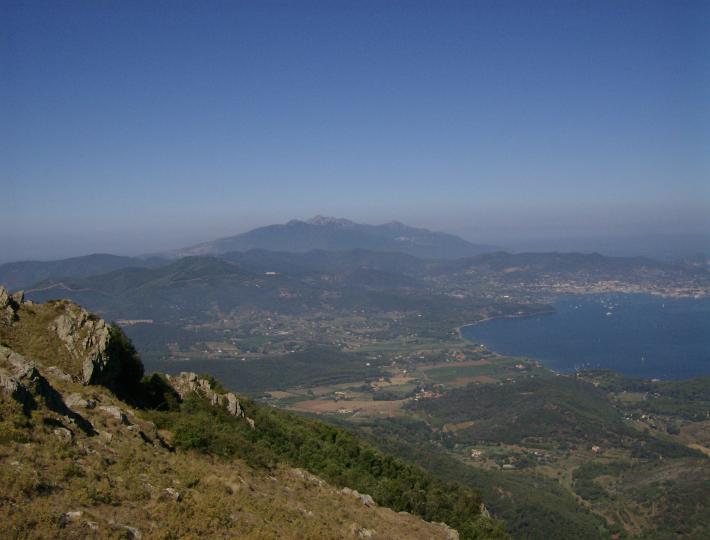 | Blick bis zur Westseite der Insel. Im Hintergrund Monte Capanne. |