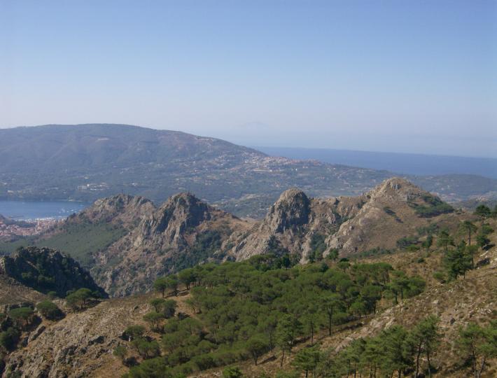 | Ganz links Monte Mar die Capanna, ganz rechts Monte Castello, dazwischen unbenannte Gipfel mit 339 und 364m |