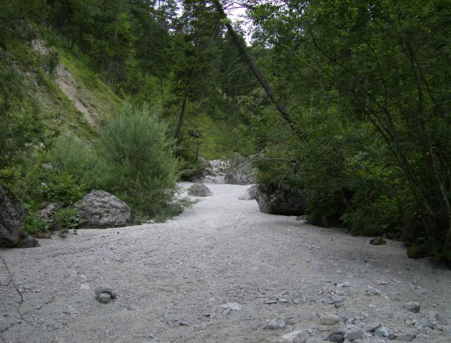 | Der Weg verläuft zunächst durch einen Wald und quert ein Bachbett. |