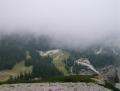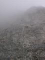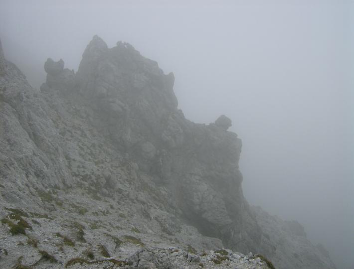| Aus dem Nebel kommen hin und wieder Felsen hervor. |