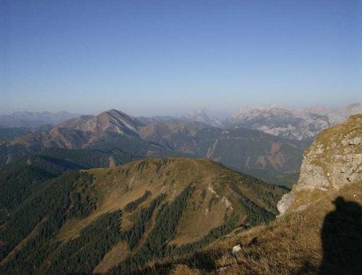 | Abstieg und Blick auf den weiteren Weg. Im Vordergrund Kragelschinken (1845m), im Hintergrund Zeiritzkampel. |