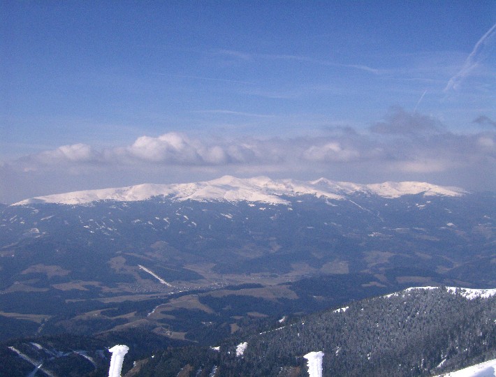 | Blick zu den Seetaler Alpen. Der höchste: Zirbitzkogel (2396m). Fast im Schatten, einer der beiden dreimal bestiegenen Berge 2006- der Kreiskogel (2306m) (der andere war der Eisenerzer Reichenstein) |