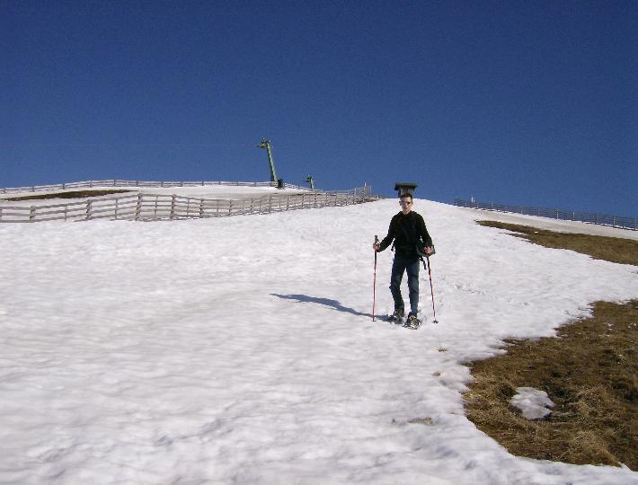| Die steile Skipiste. Matthias setzt als "Arbeitsgerät" wieder die Schneeschuhe ein. |