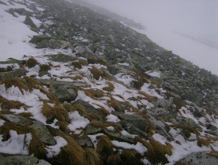 | Ab ca 2200m beginnt nun das blockige Gelände durch Schnee ein wenig rutschiger als sonst zu werden. |