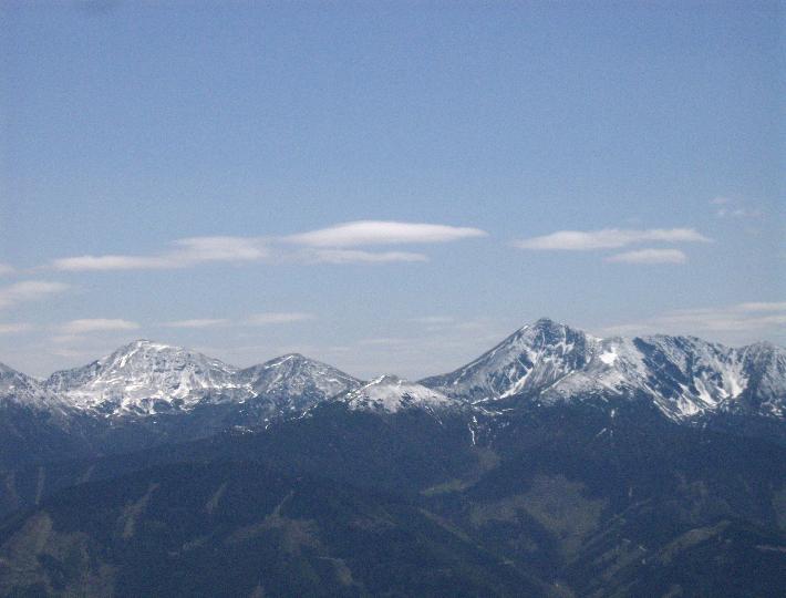 | Blick auf die 1800hm- Tour von vor zwei Wochen. Rechts Hochreichhart (2416m), dann Brandstätterkogel(2234m) und links der Maierangerkogel(2356m). Ja ok, doch ein Hatscher gewesen. |
