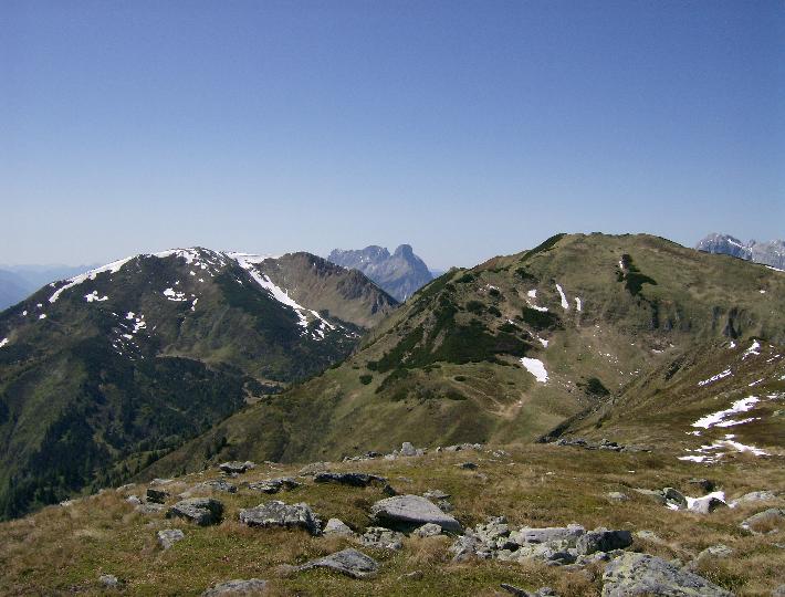 | Aber letztlich. Am Speikkogel(1993m). Blick zu Leobner(2036m) links und Lahnerleitenspitz(2027m). Hier verläuft der Kammweg weiter. Dazwischen die Admonter Trilogie. |