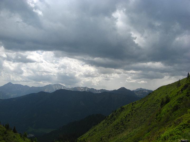 | ..aber das hier...? Kommt näher. Es wird klar: Das Gewitter wird mich erwischen. Ich kann es mir aussuchen: Entweder im freien am Grat, was bekanntlich der Gesundheit abträglich sein kann, oder rascher Abstieg über Jagdsteige in das Haberlkar und Abbruch der Tour. |