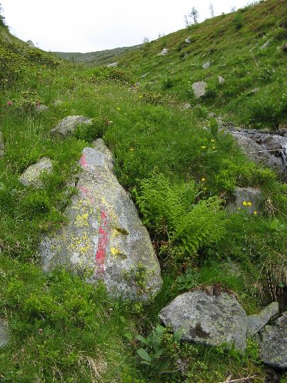 | Irgendwann war hier ein Weg. Zumindest gibt es eine alte Markierung. |
