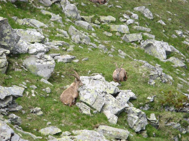 | In Gipfelnähe entdecken wir diese Gesellen. Steinböcke- sie lassen sich durch unser Rumgefummel mit den Kameras nicht aus der Ruhe bringen... |