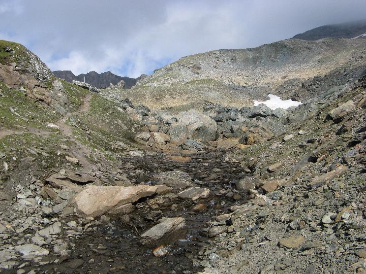 | Der Gletscher kalbt zwar nicht, aber er schmilzt. Ein kleines Bacherl wird überquert. |