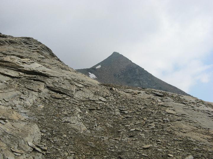 | Unschwierig deshalb, weil man auf griffigen Felsplatten aufsteigt. Der Brennkogel hat sich in der Zwischenzeit "enthüllt". Er erweist sich als ganz schön steiler Spitz. |