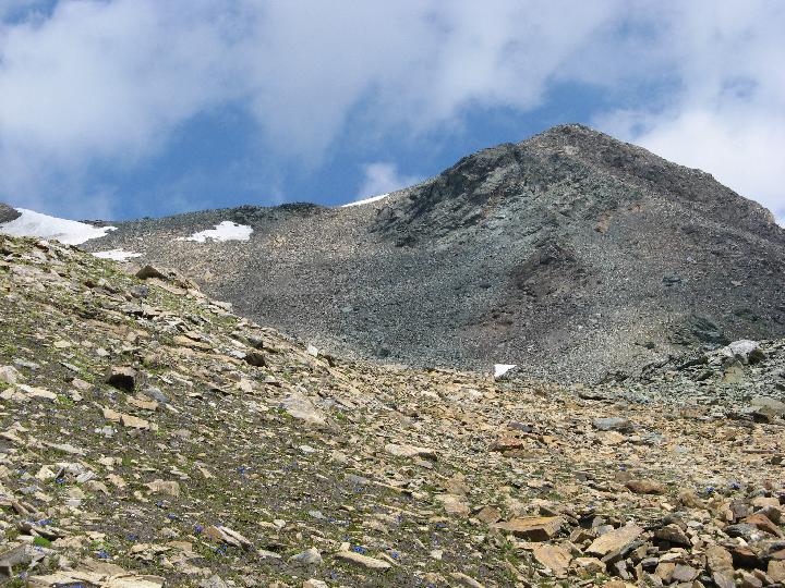 | Geschafft. Wir sind wieder am "Normalweg". Blick zurück: Rechts neben dem rechten Schneefeld in der Mitte des Bildes sind wir runter. Ok, ist schon ein wenig rustikal. |