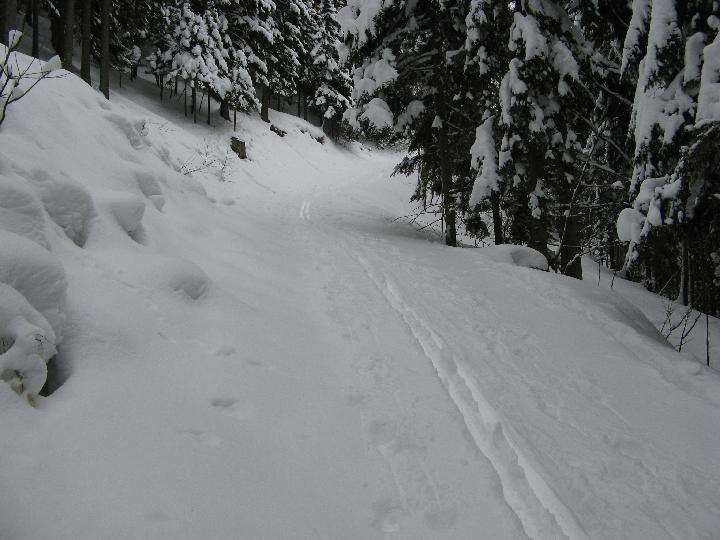| Immerhin bin ich heute Nachmittag nicht der Erste. Selbstverständlich gehe ich neben der Skispur, nicht in ihr. |
