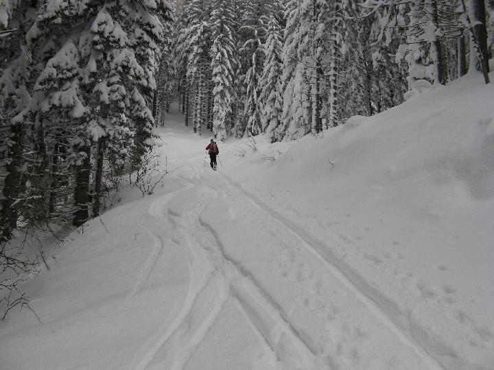 | Ein Stück weiter oben. Die Umgehung des steilen Stückes ab dem Marterl habe ich hinter mir. Mühelos überholt mich ein Tourengeher. Während ich einen Schritt in den Tiefschnee setze, zieht er drei Schritte in der Spur. Leichter Frust kommt auf. Habe ich doch das falsche Gerät an den Füßen für solche Verhältnisse? |
