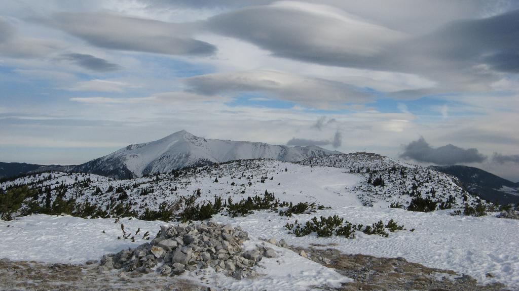 | Hier heroben ist der Schnee weitgehend abgeblasen, ich lege die Schneeschuhe ab. |