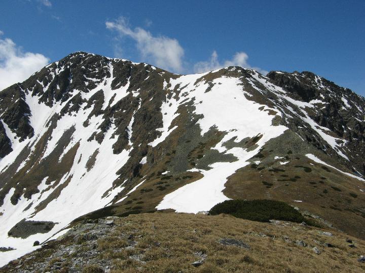 | Hier der weitere Aufstieg. Über die Kante rechts hinauf und dann nach links. Das obere steile Schneefeld, das zu queren ist, macht mir ein bissl Sorgen. |