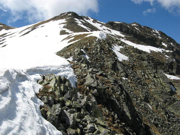 | Eine etwas würzige Stelle. Der Weg ist überwächtet und das Schneefeld fällt steil ab. Ich muß rechts dran vorbei.... |