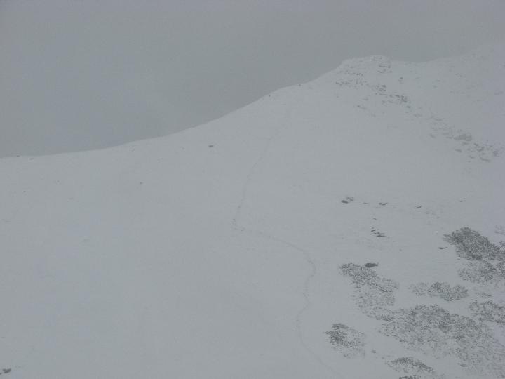 | Blick zurück. Zoom auf die Aufstiegsspur zum Grat auf den Schreinl. Schön sieht man die direkte Linie. |