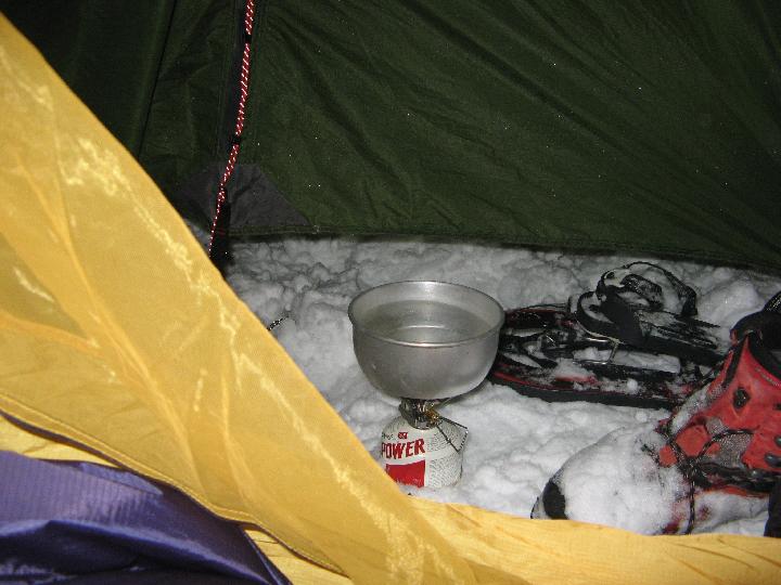 | Dann wird mal Wasser für das Abendessen warmgemacht. Ich koche im Vorzelt. |