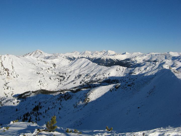 | Links Hochrettelstein, in der Mitte der Plannerkessel mit Schigebiet. |