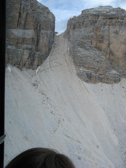 Blick aus der Seilbahn auf den Zickzackweg in der Scharte.