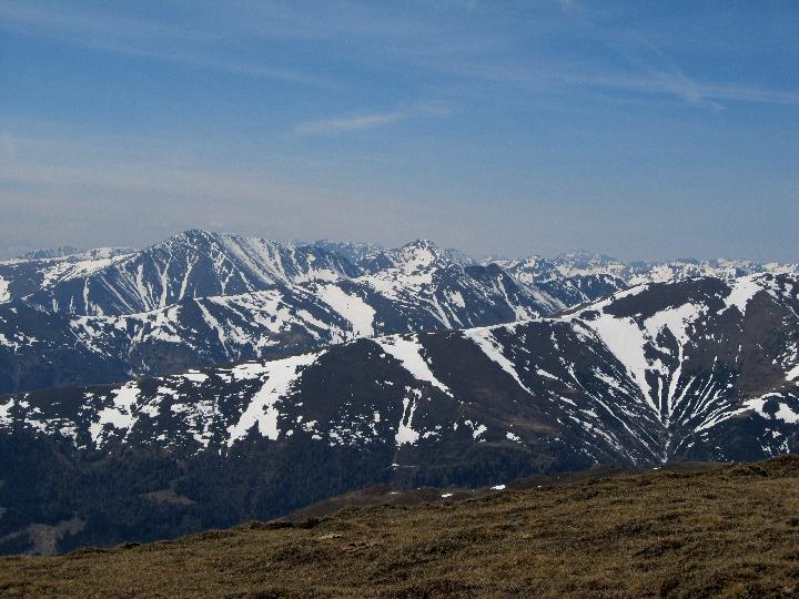 Blick in die Wölzer Tauern. Im Hintergrund Graim und Rettlkirchspitze, dazwischen der Grat Stangeneck, Knollischarte und im Vordergrund der Grat Roßalmspitz- Gstoder. ![]() |