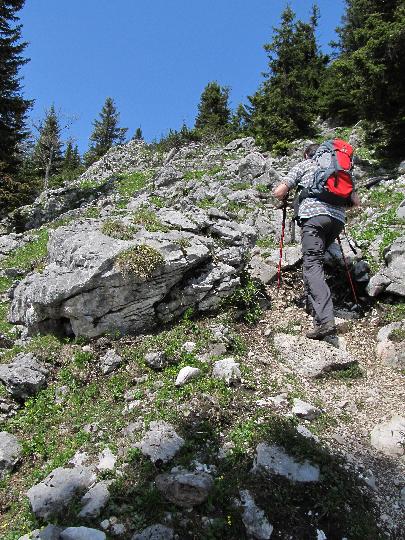 Auf der Wiesenseite des Grates geht es nun zunächst recht steil dahin. ![]() |